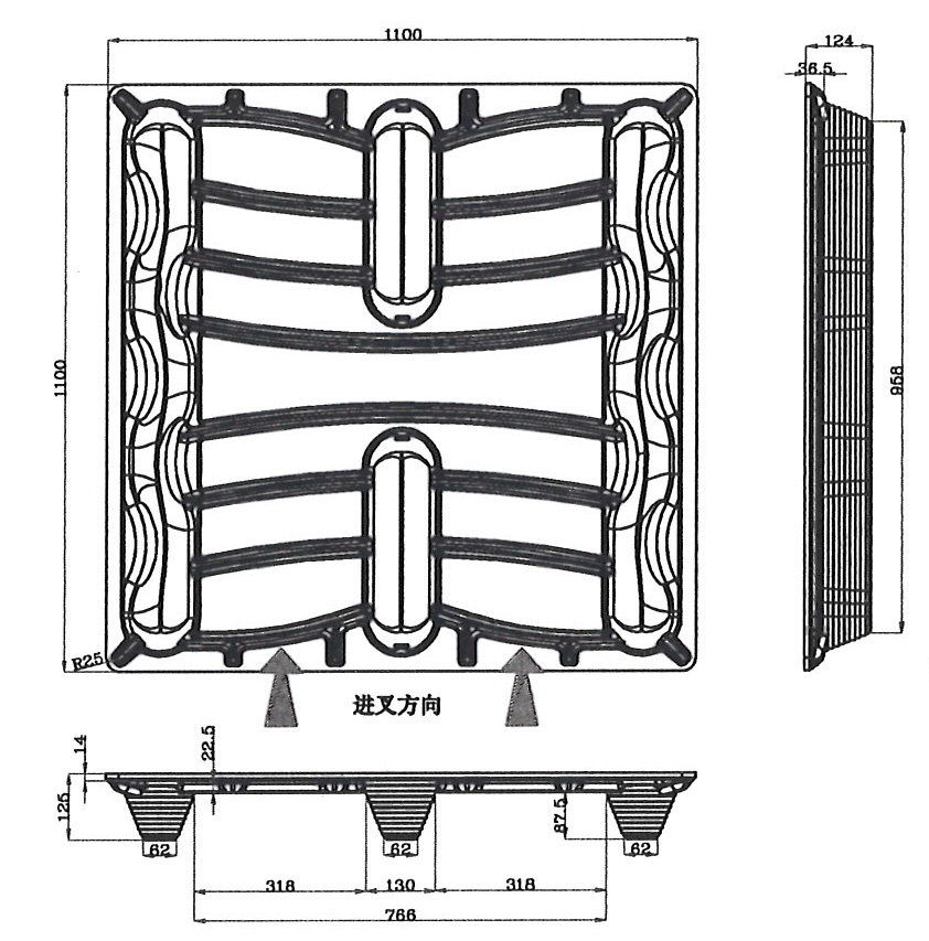 | V-L2-110110-87 | 1100*1100*125 | 2000 | 7000 | 60pcs | 1200pcs | 18±1 | 二叉口 | 兩向 | O |