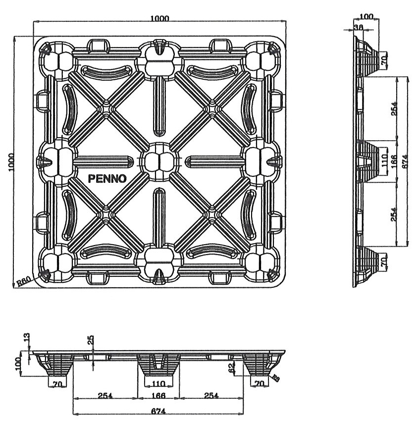 | V-F4-100100-62 | 1000*1000*100 | 2200 | 7500 | 60pcs | 1320pcs | 15±1 | 四叉口 | 四向 | O |