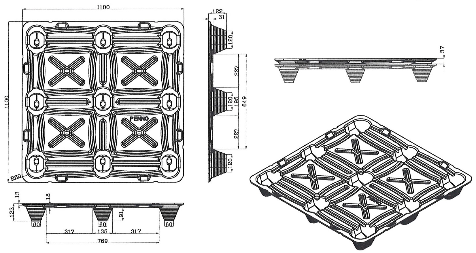 | V-ST4-110110-91 | 1100*1100*123 | 1800 | 6500 | 62pcs | 1240pcs | 17±1 | 四叉口 | 四向 | O |