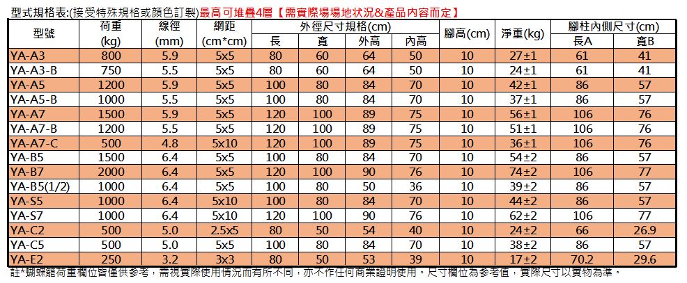 說明:因輪子正常高度為16cm左右再加腳架堆疊時有2cm凹槽,所以輪子差不多會在籠內8cm如較重在稍微變形要抓10cm左右在籠內較保險,正常一格間距5cm所以如要堆疊建議下層要放到2格以下才不會導致輪子壓到貨品造成損傷。