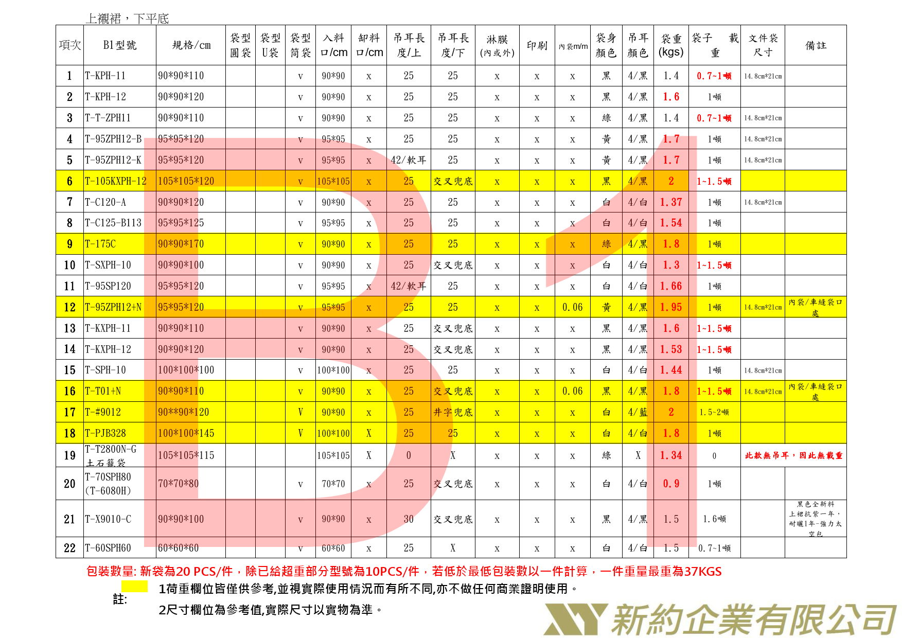 1.裝載物需平均荷重且不能有尖銳物,如尖銳物造成袋子破損發生工安或強度減弱,我們皆不負責後續問題,請自行注意使用安全,表格荷重皆以裝全新塑膠粒狀物(圓滑類似米粒大小顆粒狀)為使用標準。