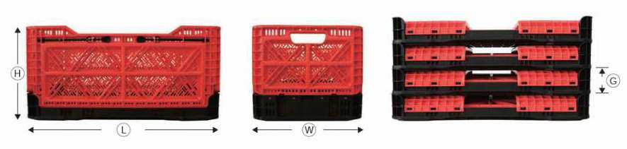 | 型號 | L-外徑長(mm) | W-外徑寬(mm) | H-外徑高(mm) | L-內徑長(mm) | W-內徑寬(mm) | H-內徑高(mm) | G-折疊高度(mm) | 容積(Liter) | 重量(Kg) | 荷重(Kg) | 靜荷重(Kg) |