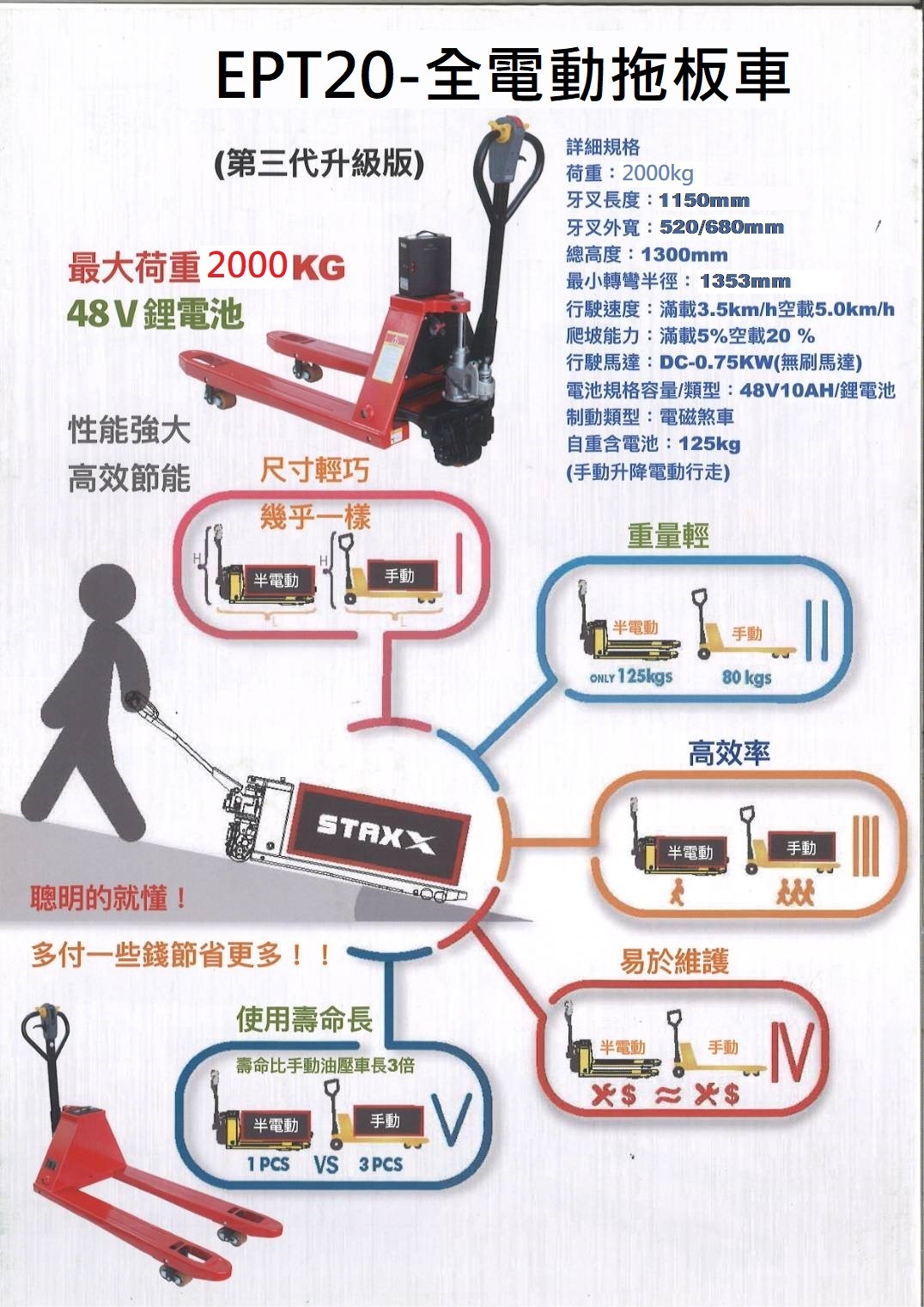 超輕便,高效率電動油壓車 【EPT20全電動】手把基本功能操作配備:電動昇降控制扭&電動前進後退,蝶型開關,{【安全裝置】把手中間紅色緊急反向按鈕,後退時如有狀況按下或身體碰觸到紅色緊急紐,會自動往前跑避免人員撞壓},喇叭,電池時數顯示燈,錯誤代碼顯示,充電警報,多功能人體工學把手。